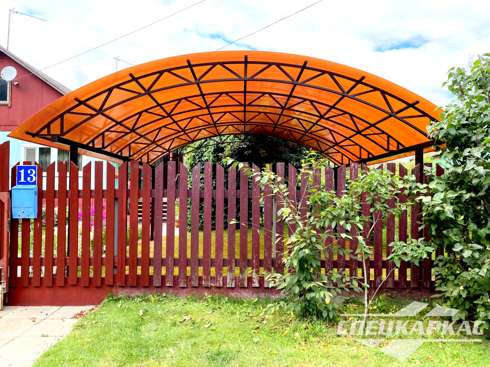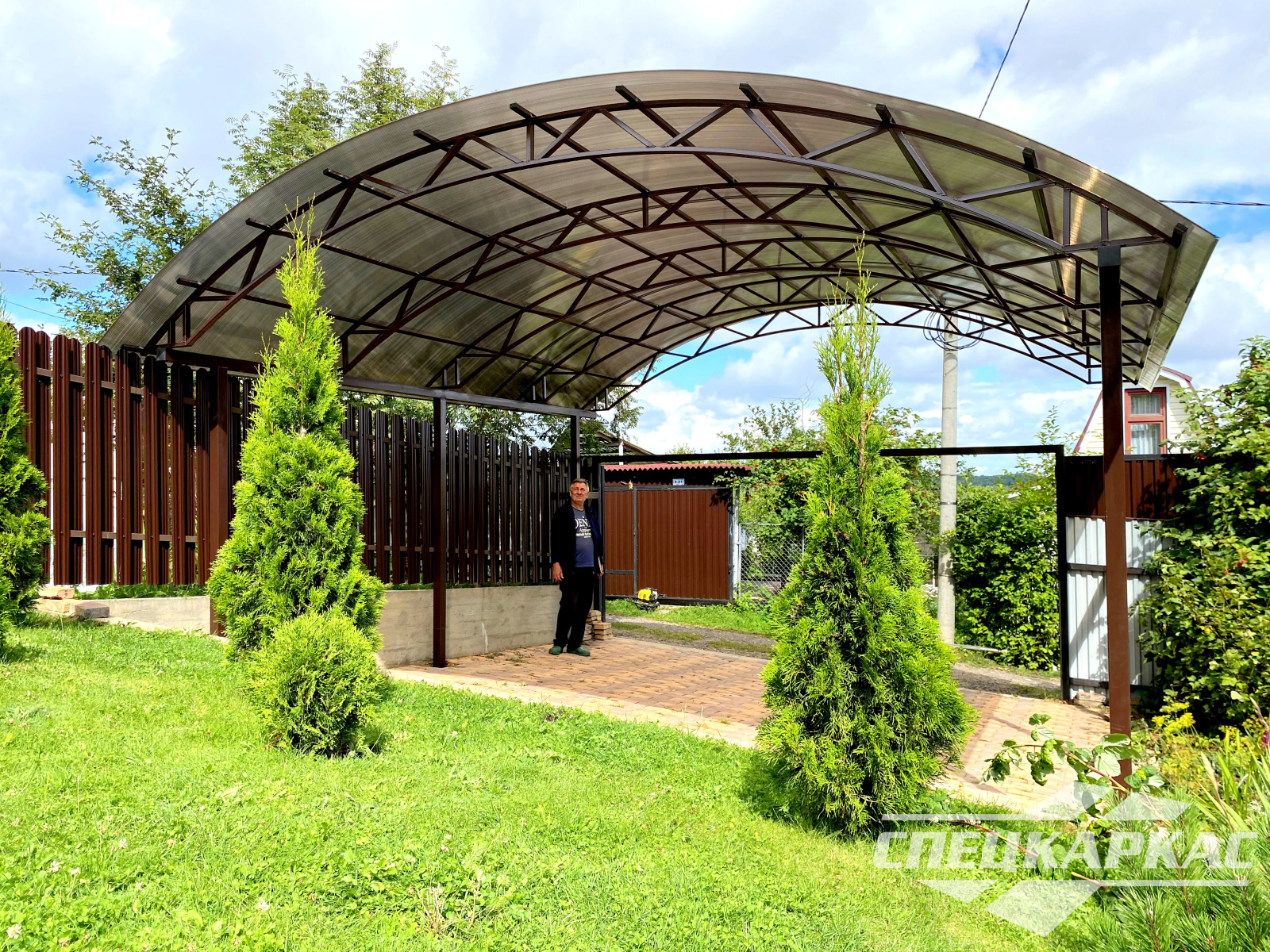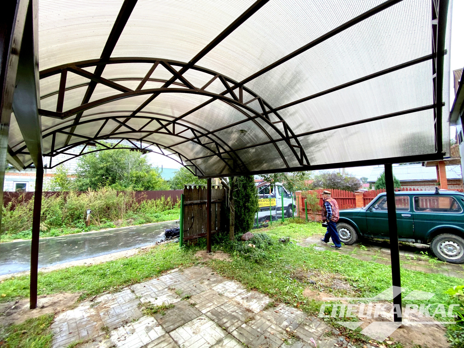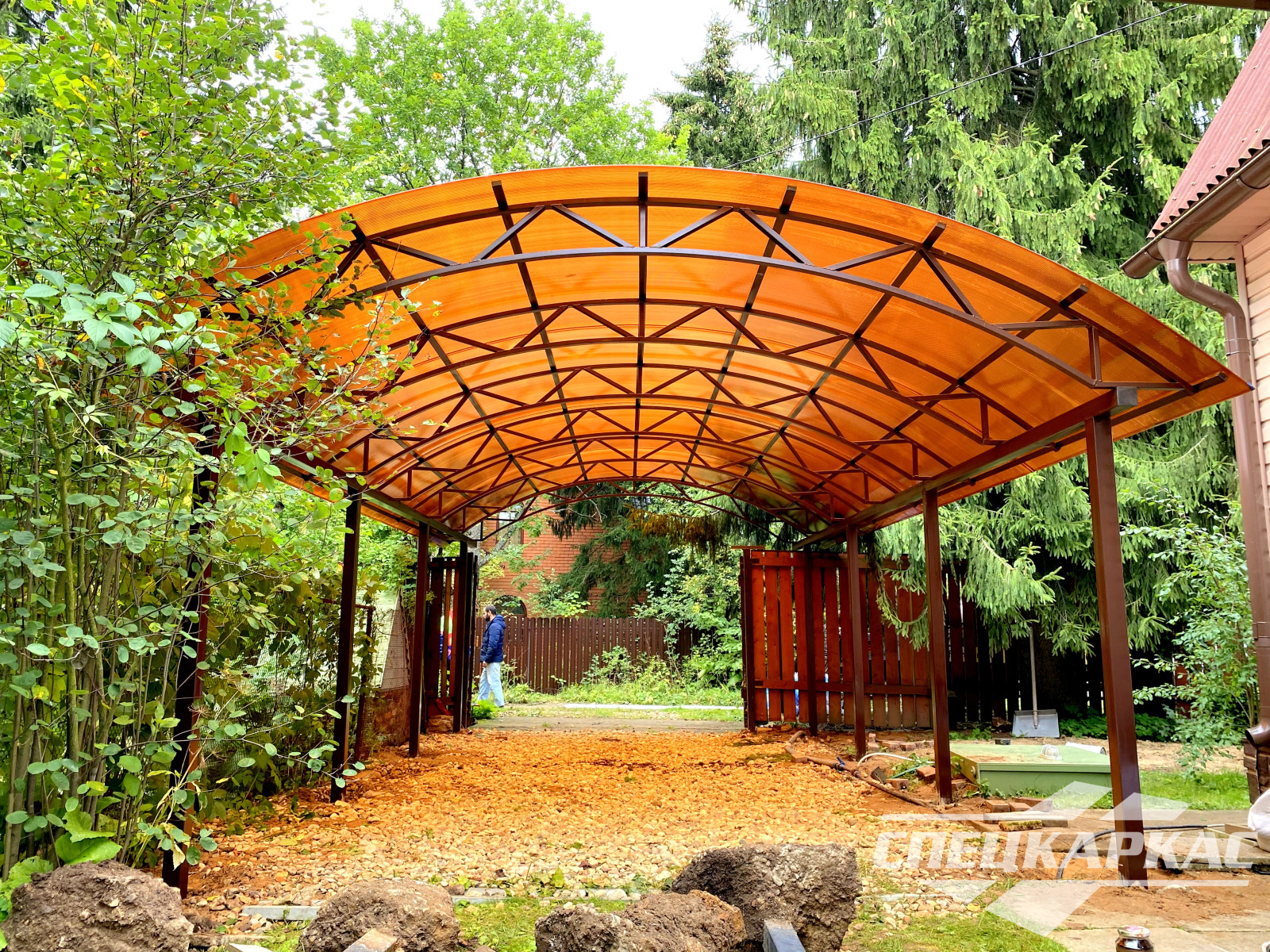 Навес из листов поликарбоната способен стать настоящей «изюминкой» частного дома и приусадебной территории. Полупрозрачные сооружения эстетичны и надежны. Их устанавливают всего за 1-2 дня, за ними легко ухаживать – достаточно чистой воды и неабразивного средства. На первый взгляд кажется, что без такой конструкции вполне можно обойтись. Но стоит купить навес из поликарбоната от компании «Спецкаркас» – и жизнь станет намного проще и комфортнее. Ваше авто больше не будет ржаветь под дождем, крыльцо останется чистым даже в снегопад, на участке появится уютная зона отдыха в кругу друзей и близких.